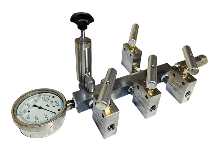 1/4″ NPT Pressure Test Manifold with Check Valve, Gauge & PSV 15000 PSI – TM4-15K-4VCGP